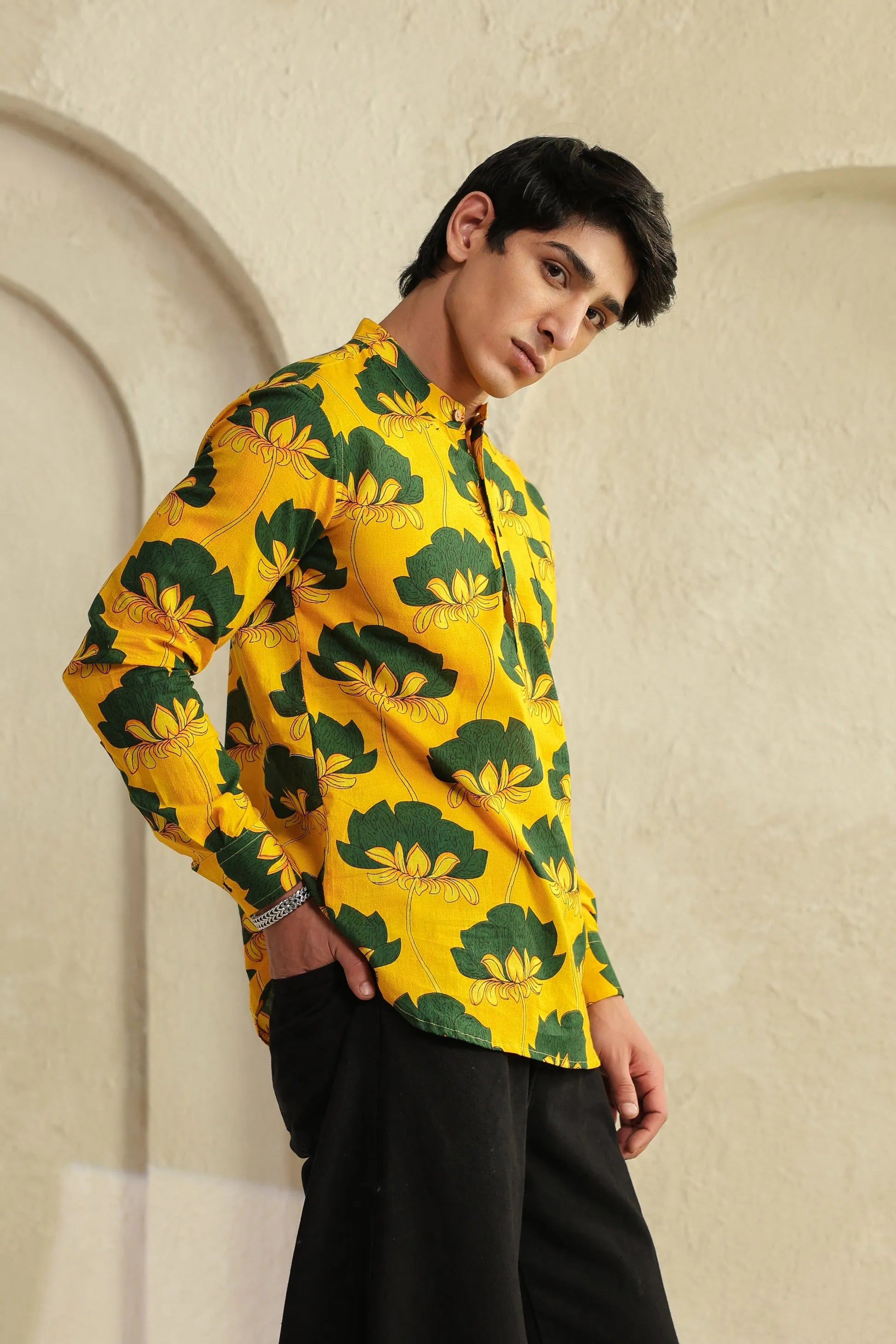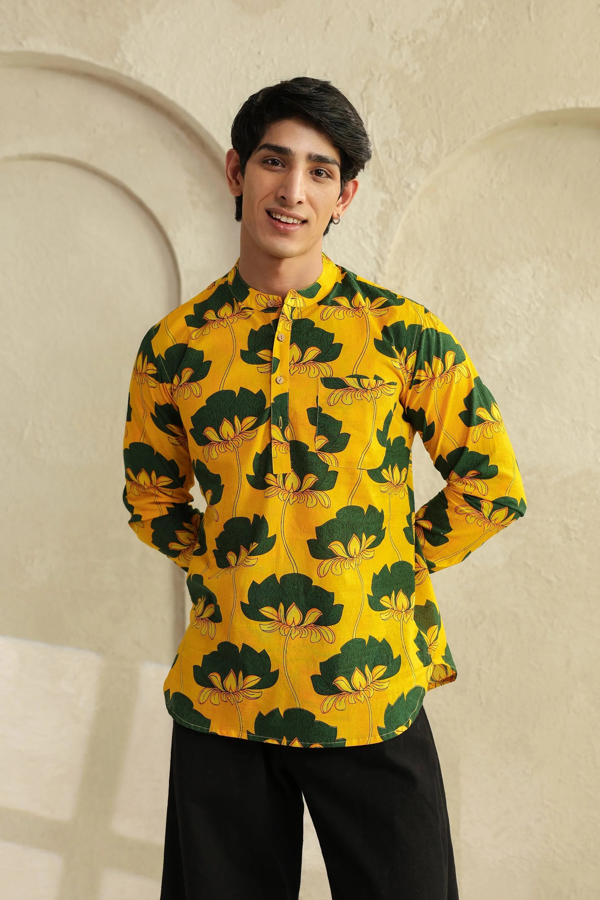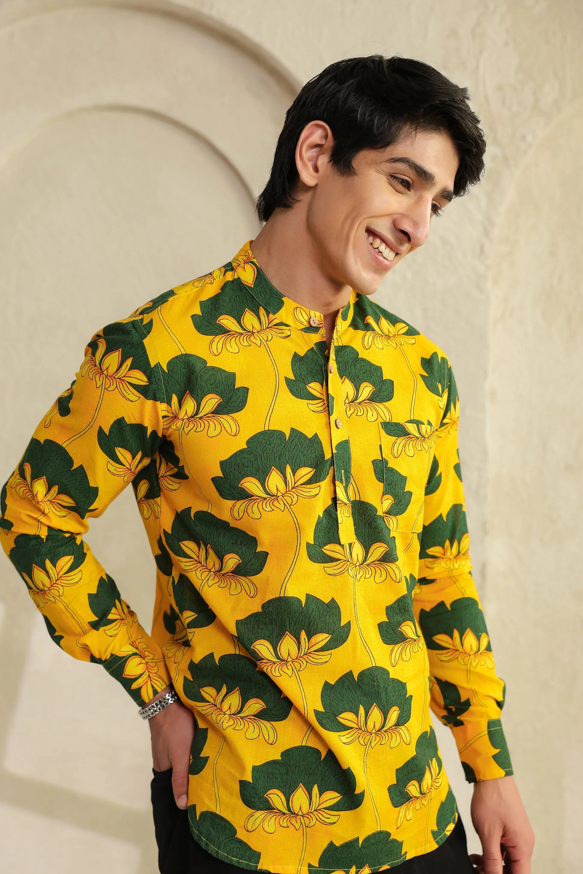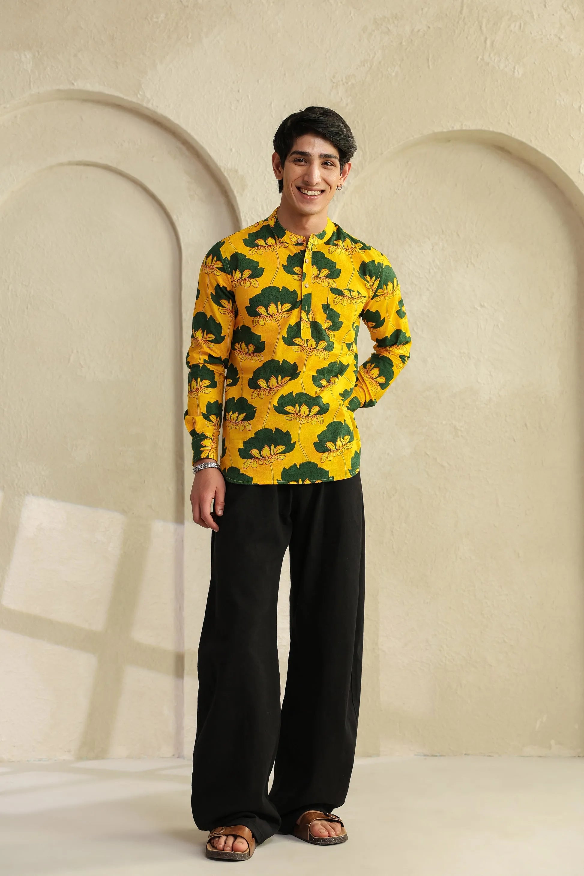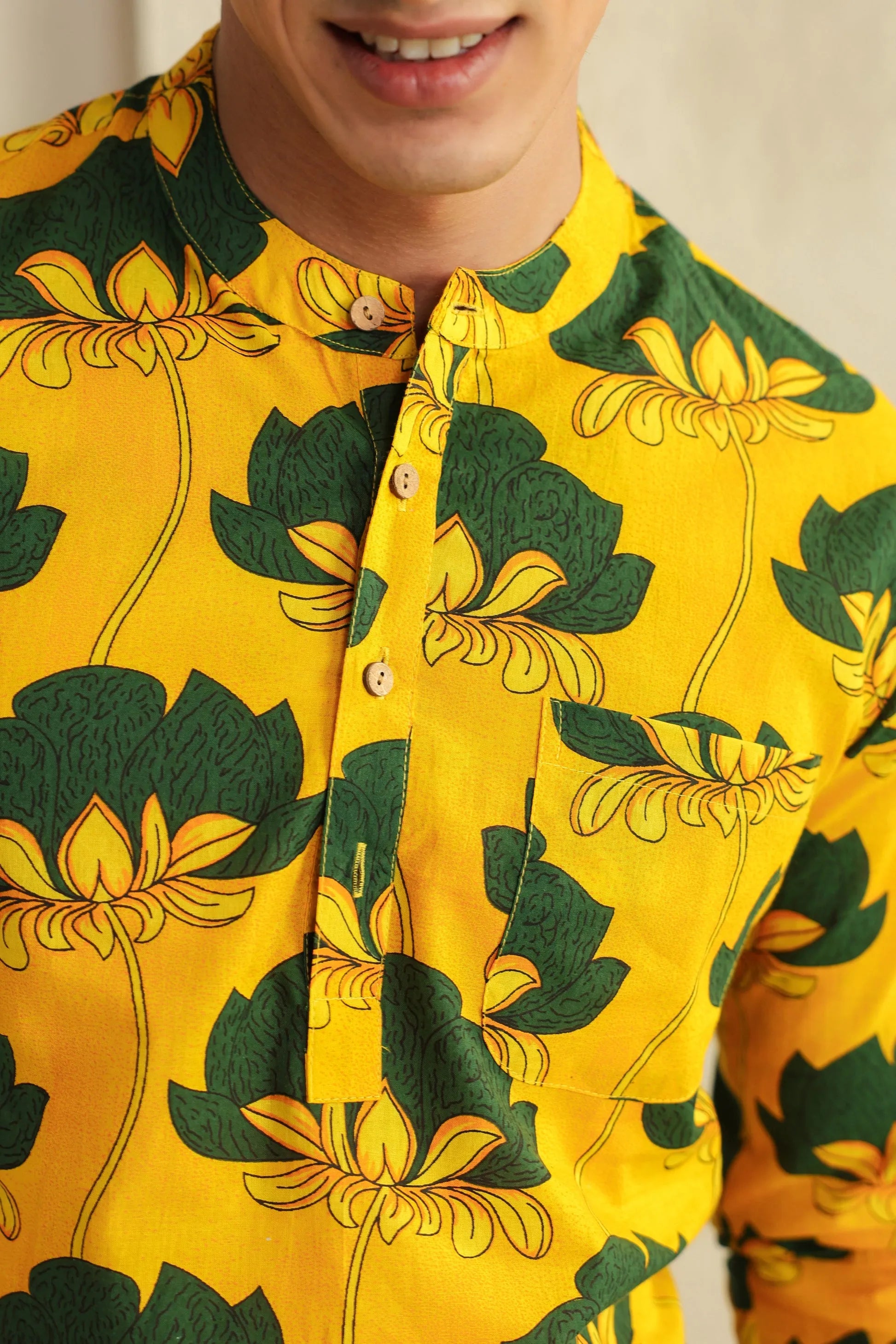 The Yellow Bloom Printed Cotton Kurta is a vibrant expression of cultural artistry and modern tailoring. Designed with a radiant yellow base and bold green floral patterns, this kurta captures the spirit of Indian festivities while maintaining a clean, contemporary appeal. Each print reflects intricate craftsmanship, adding a touch of tradition to every detail.