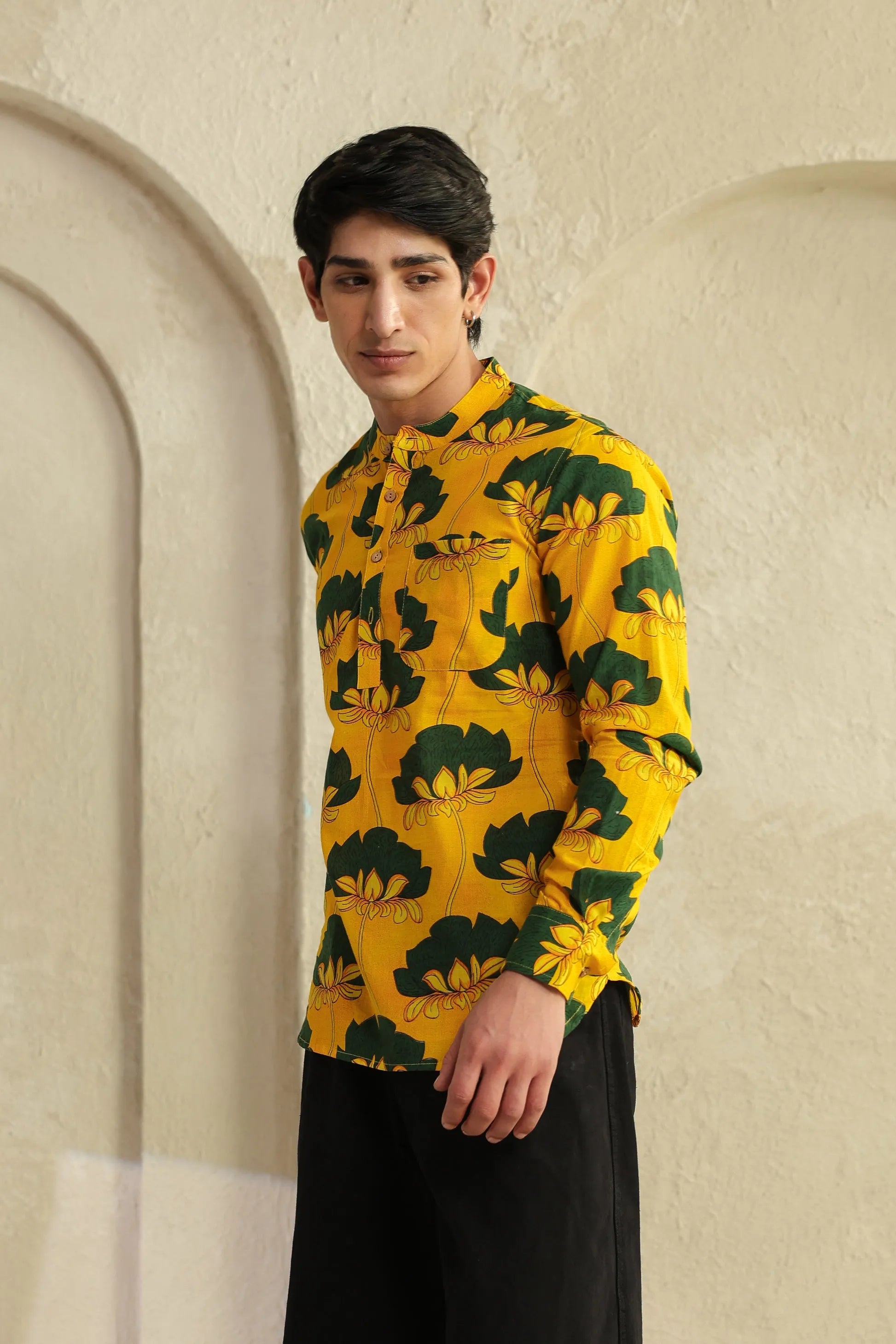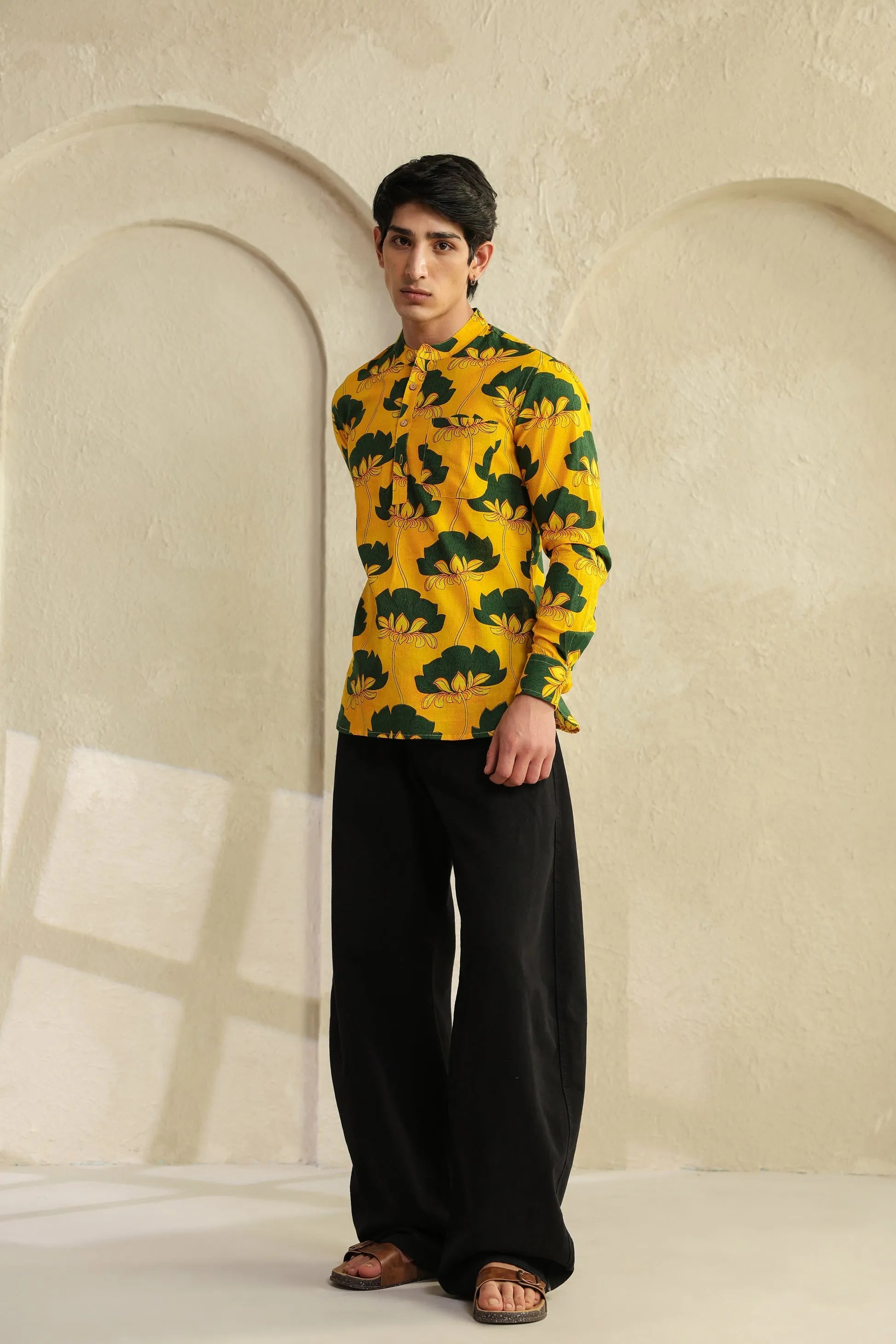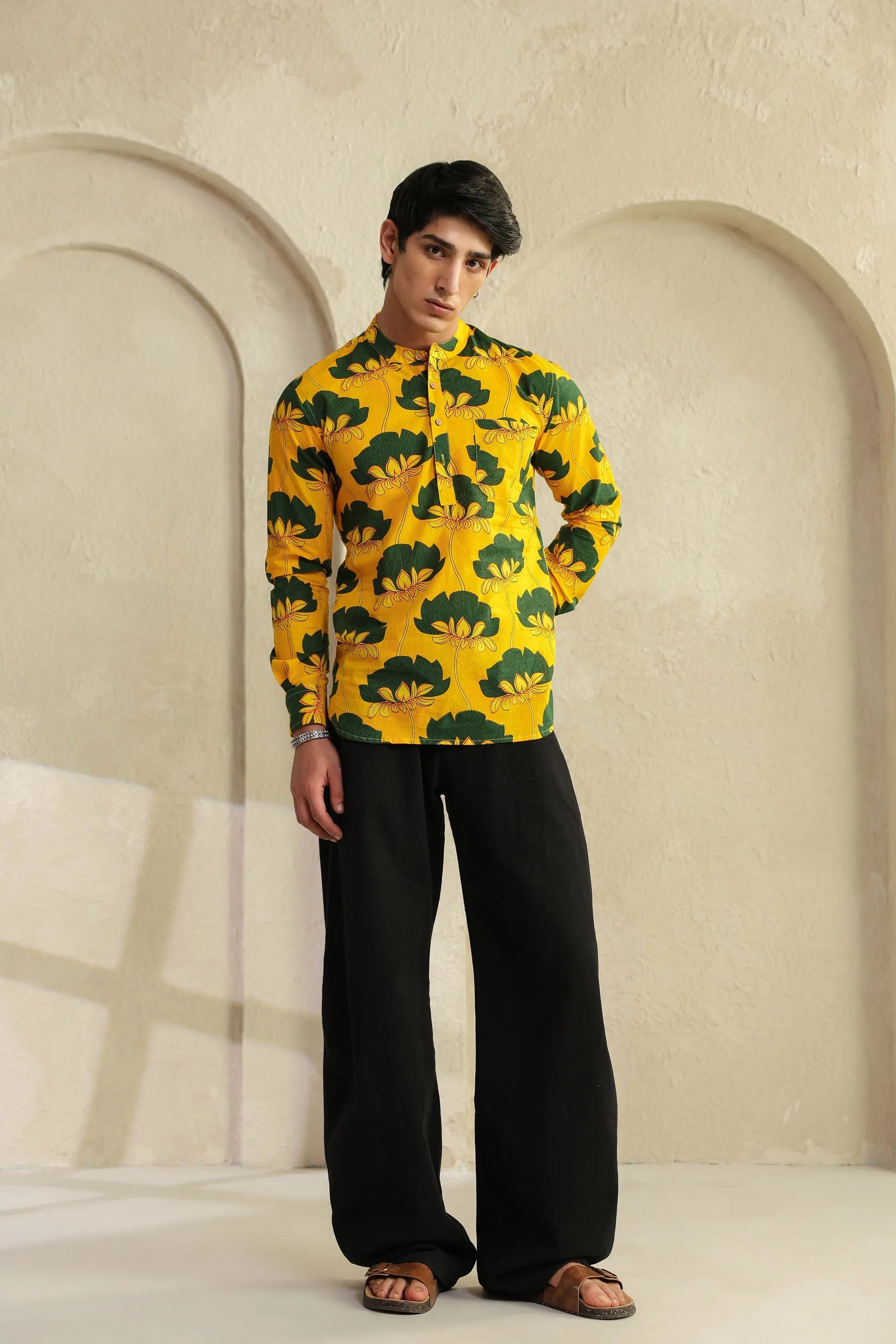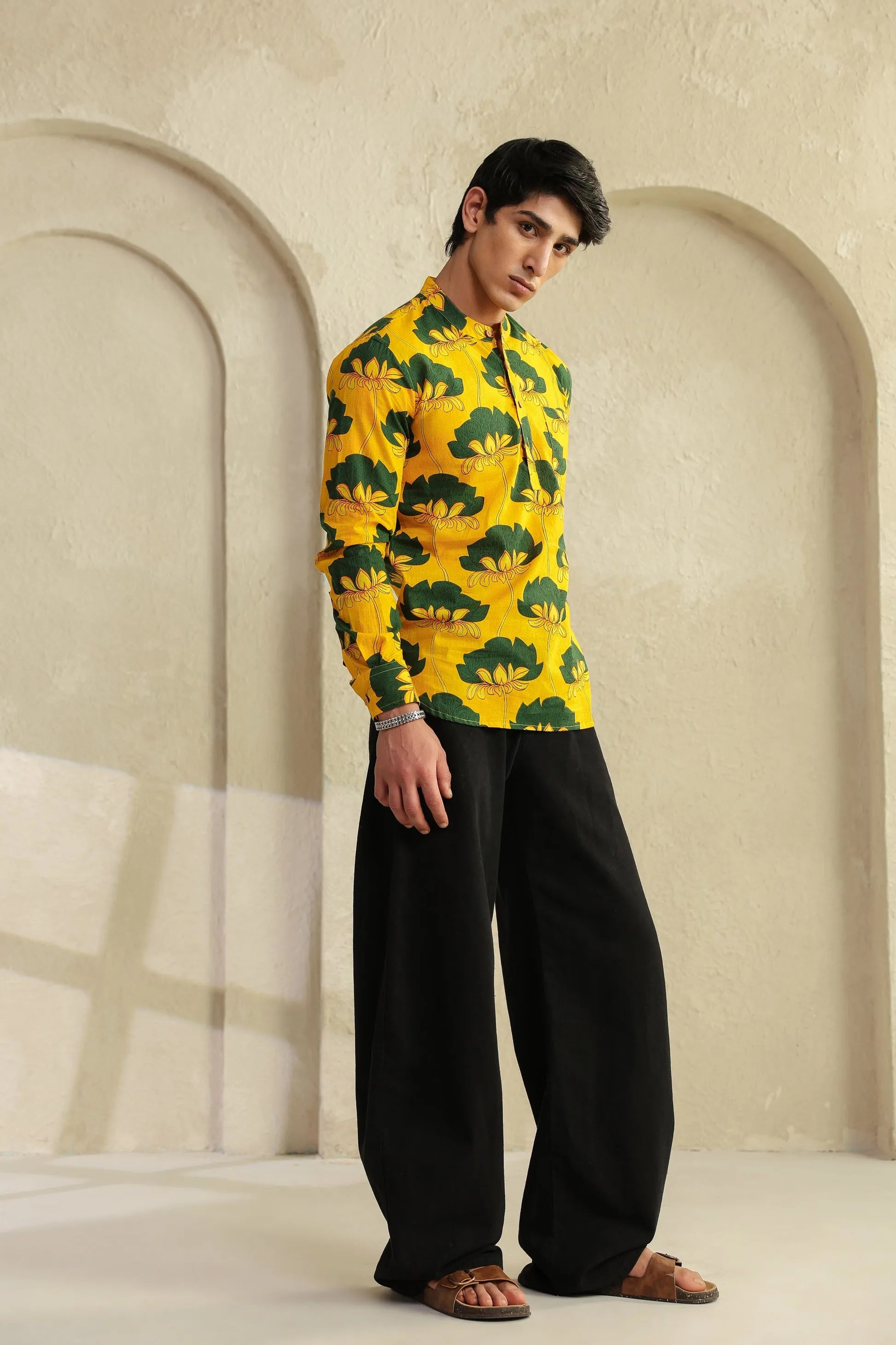 The Yellow Bloom Printed Cotton Kurta is a vibrant expression of cultural artistry and modern tailoring. Designed with a radiant yellow base and bold green floral patterns, this kurta captures the spirit of Indian festivities while maintaining a clean, contemporary appeal. Each print reflects intricate craftsmanship, adding a touch of tradition to every detail.
