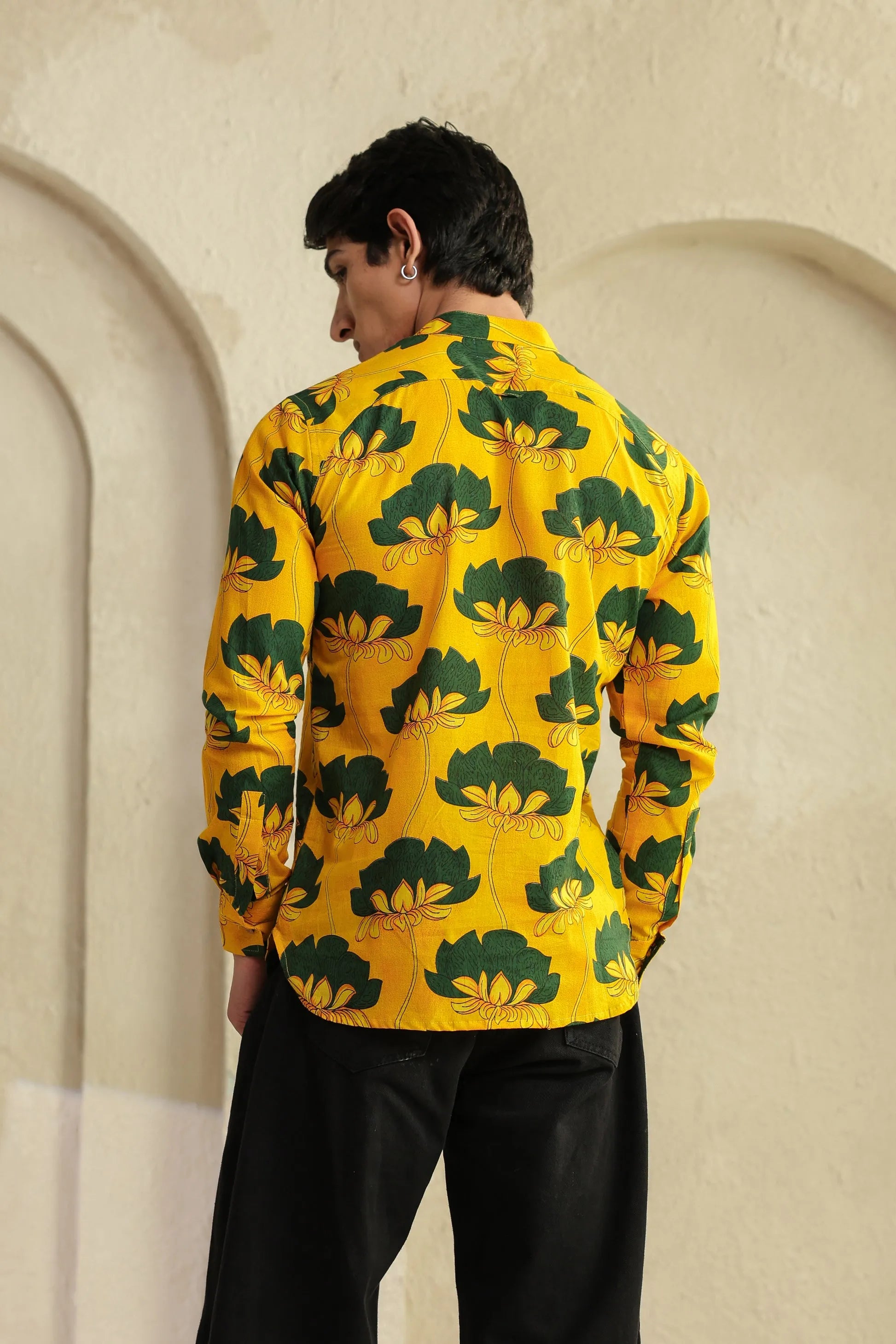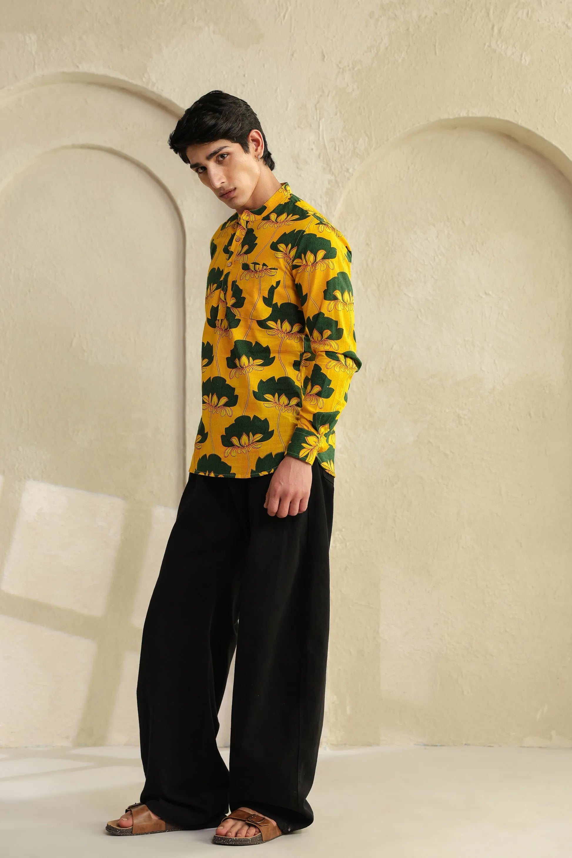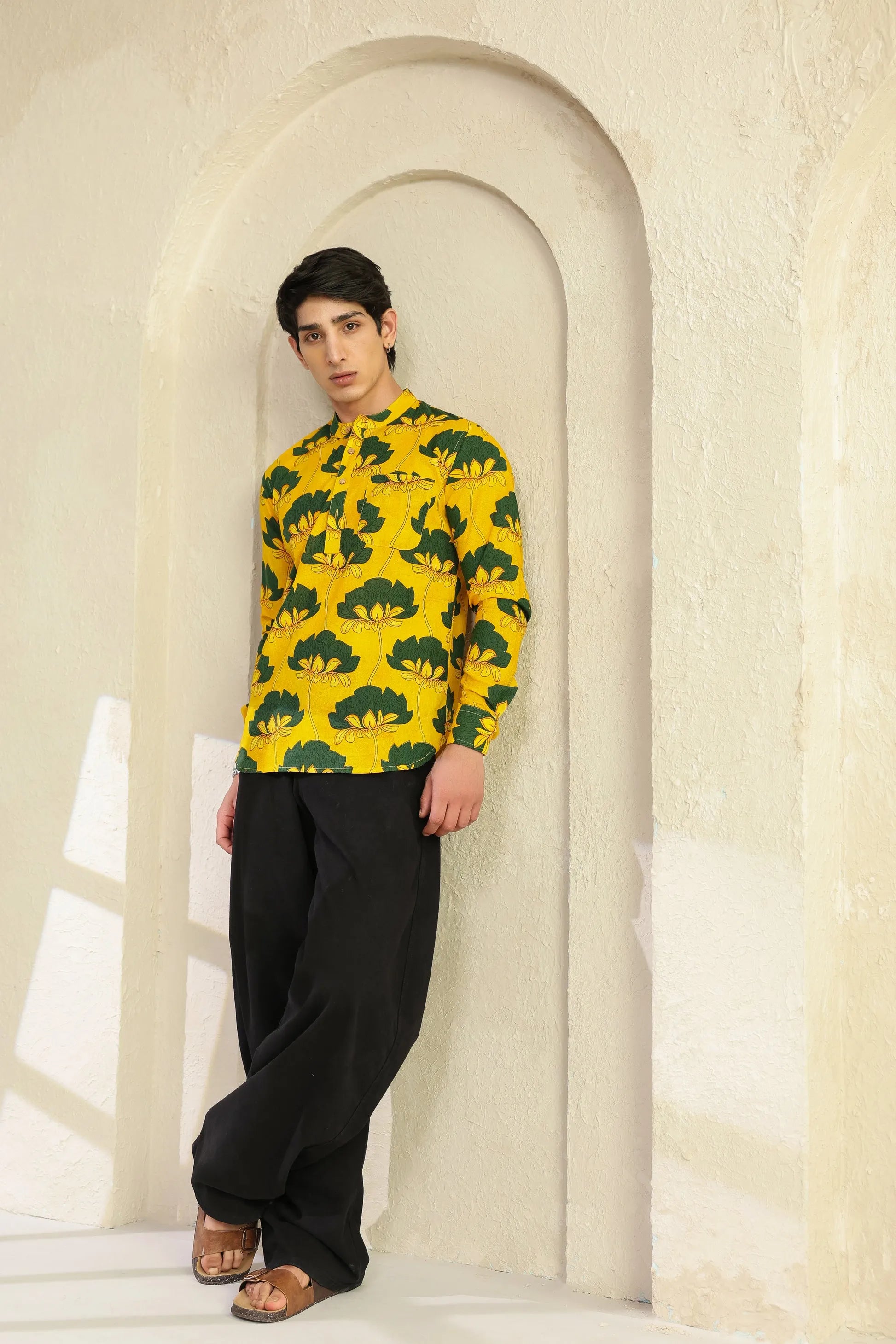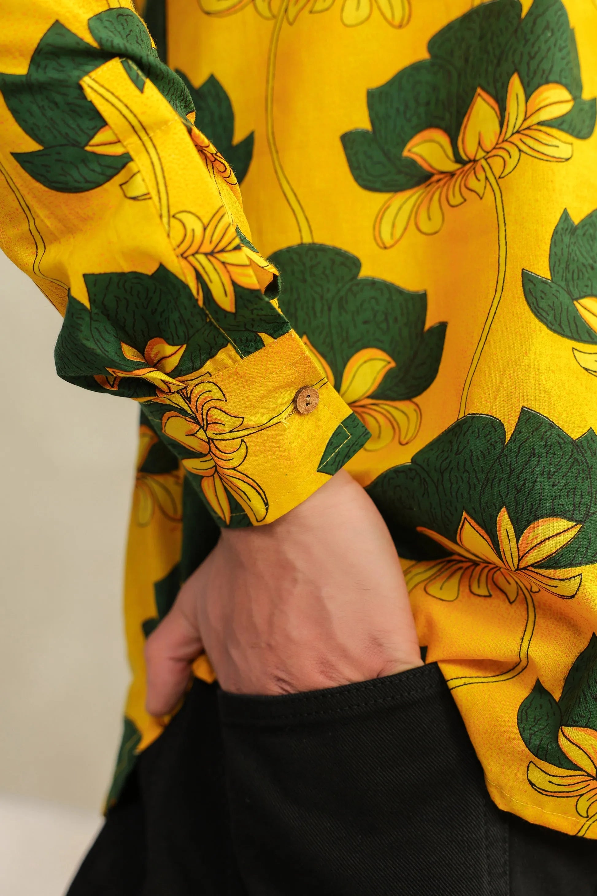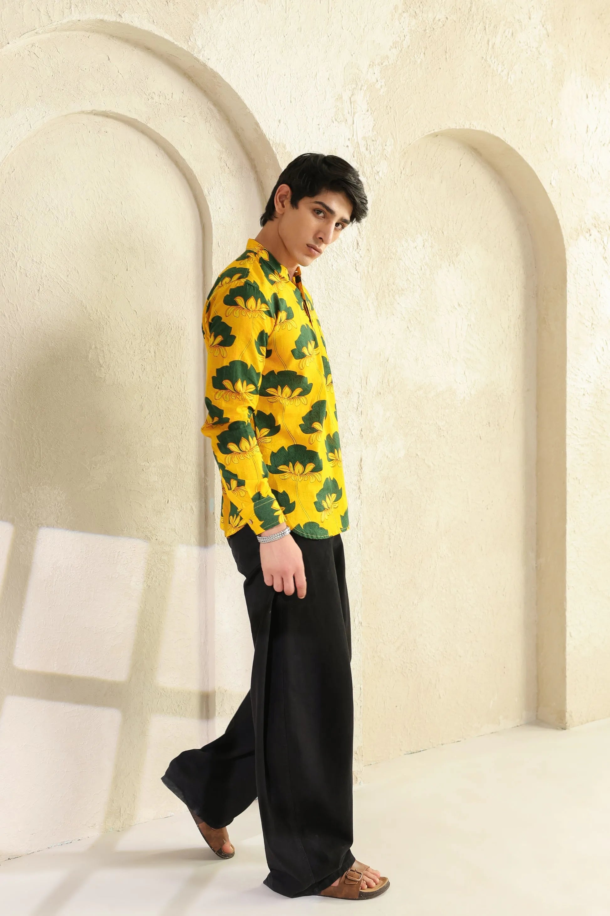 The Yellow Bloom Printed Cotton Kurta is a vibrant expression of cultural artistry and modern tailoring. Designed with a radiant yellow base and bold green floral patterns, this kurta captures the spirit of Indian festivities while maintaining a clean, contemporary appeal. Each print reflects intricate craftsmanship, adding a touch of tradition to every detail.