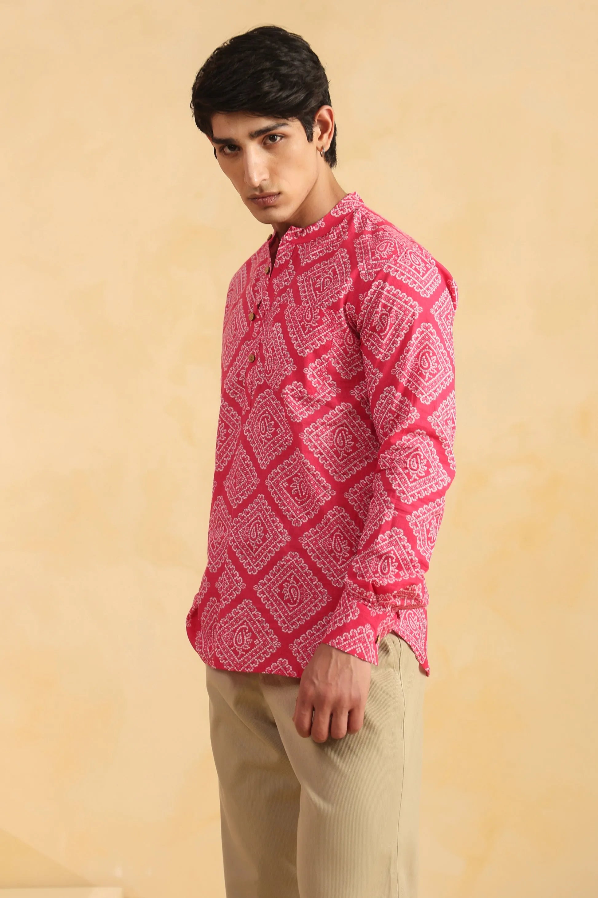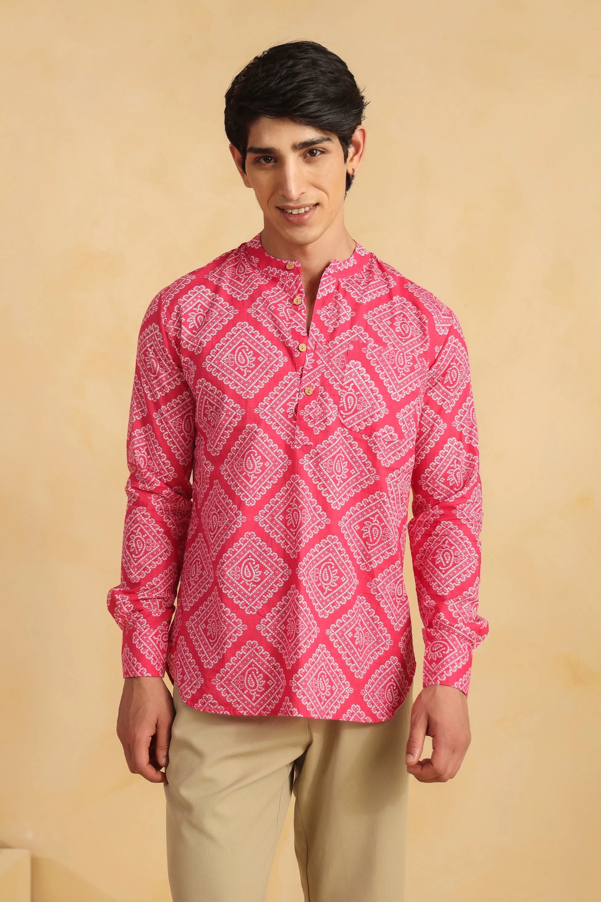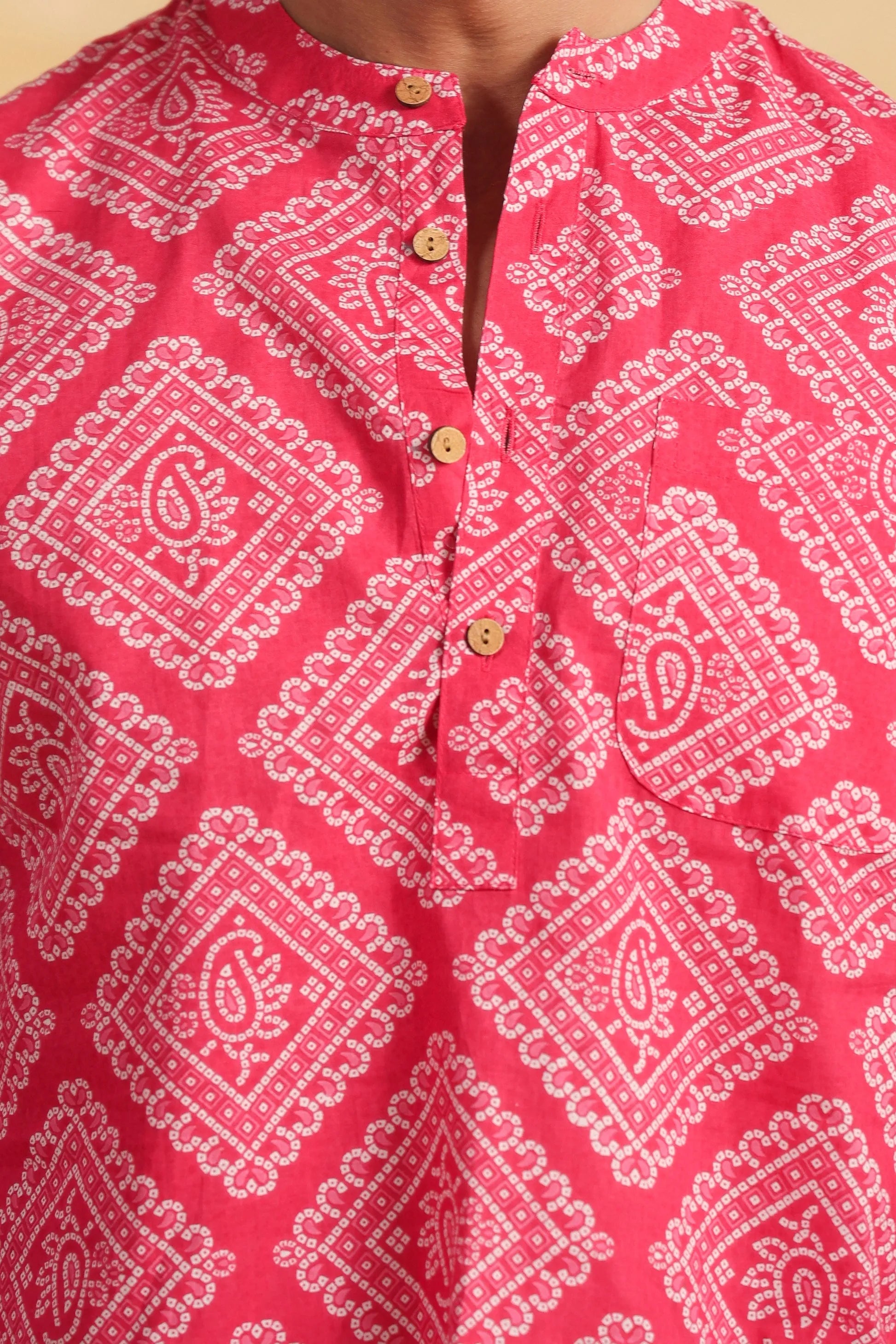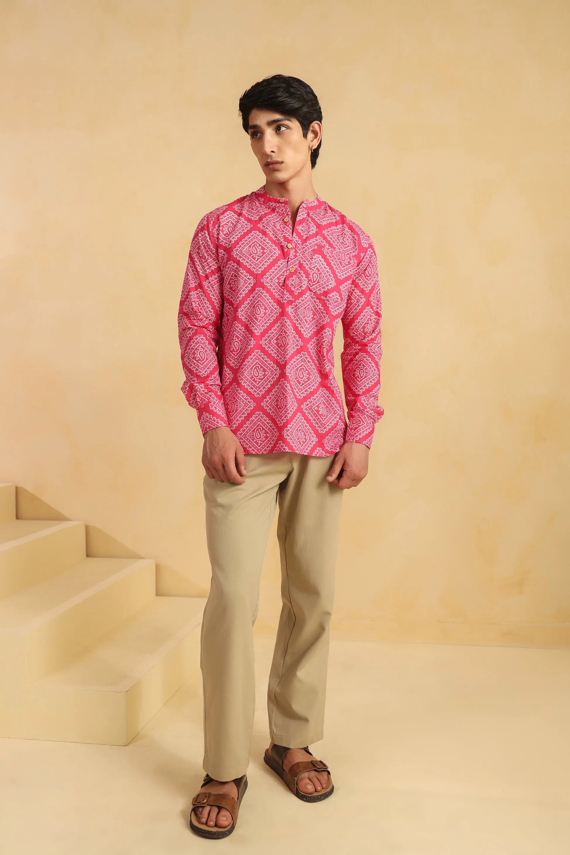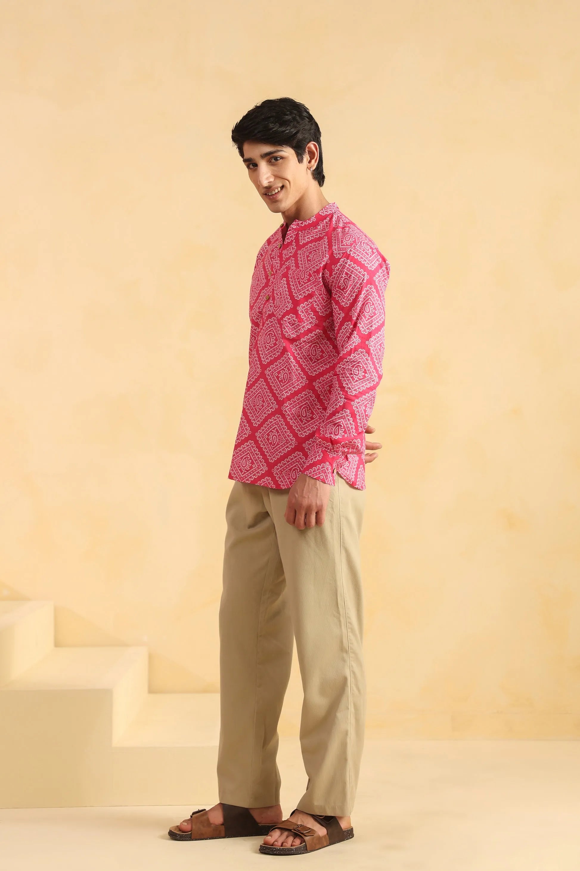 The Pink Bandhani Printed Cotton Short Kurta brings a refreshing blend of traditional charm and modern flair. Featuring a lively pink base adorned with classic white Bandhani-inspired motifs, this kurta radiates festive energy and cultural richness. The intricate print pattern adds visual depth, making it a standout piece for both daytime celebrations and casual gatherings.