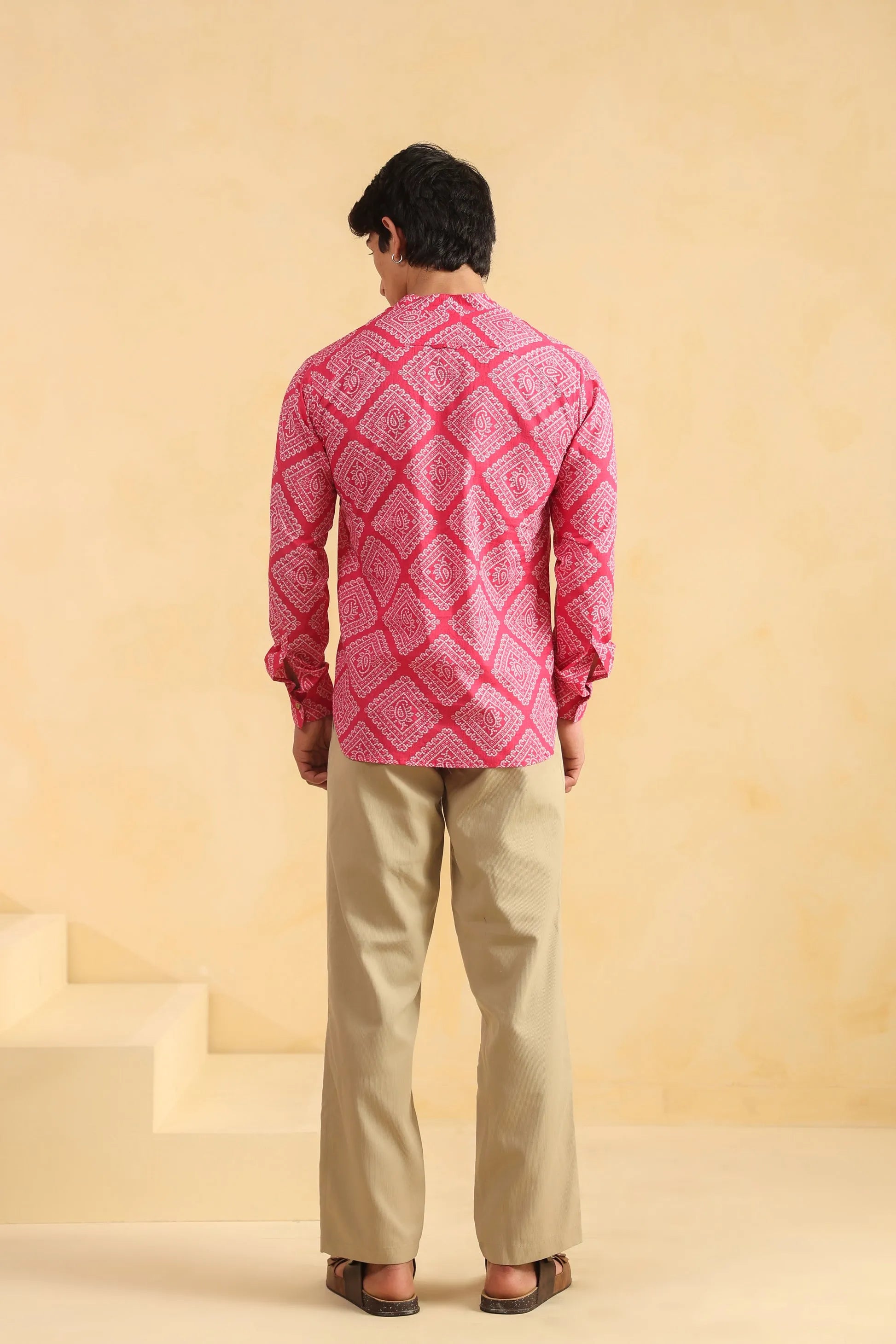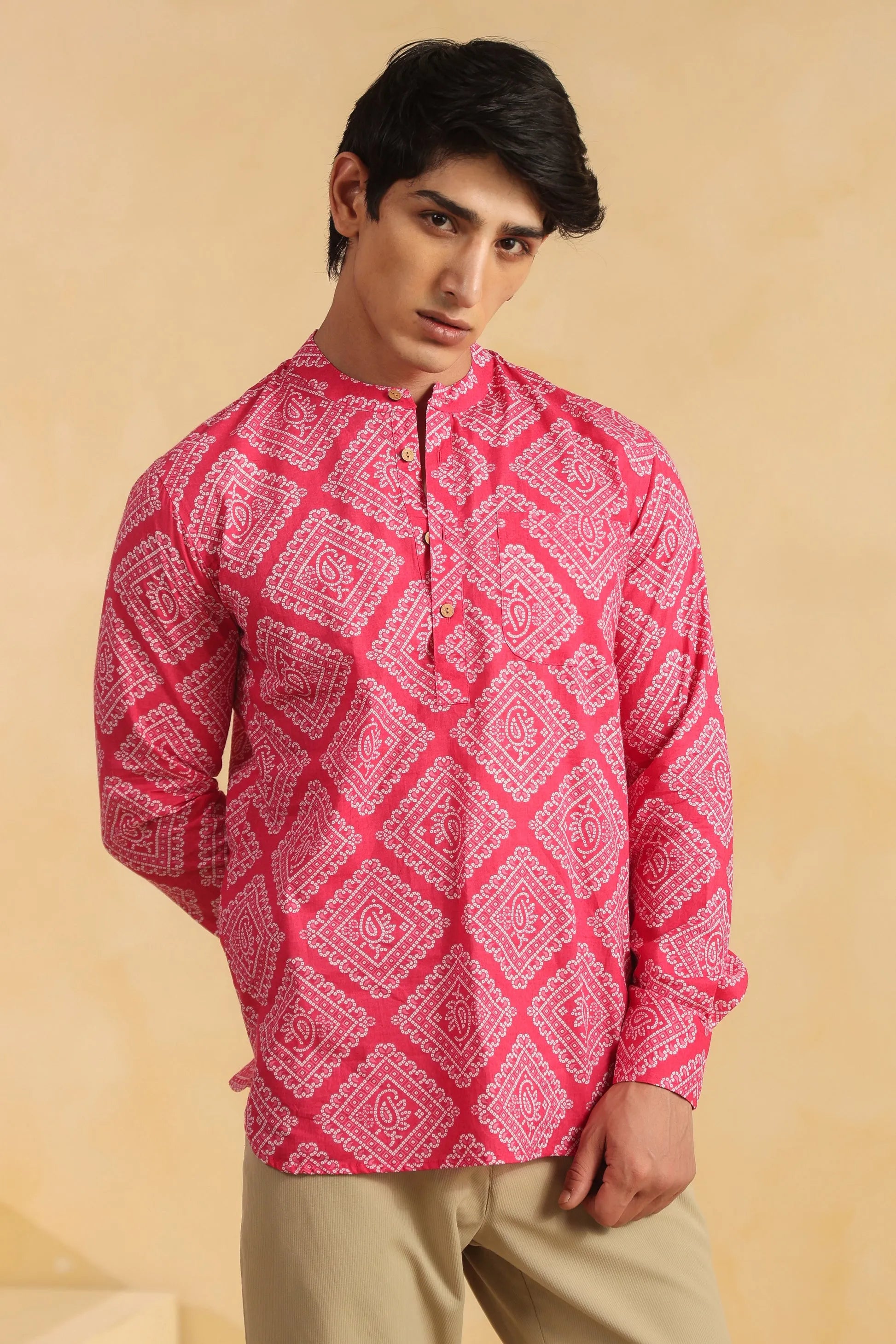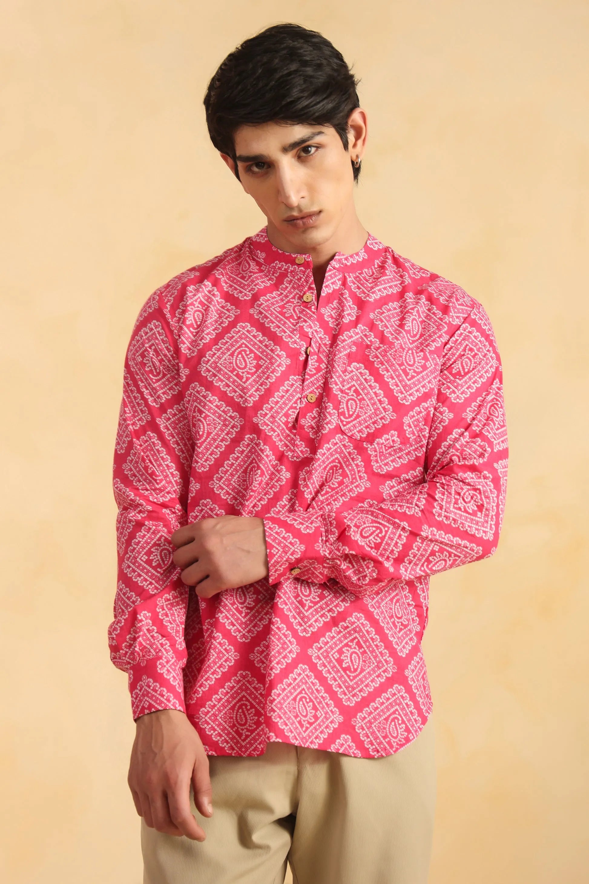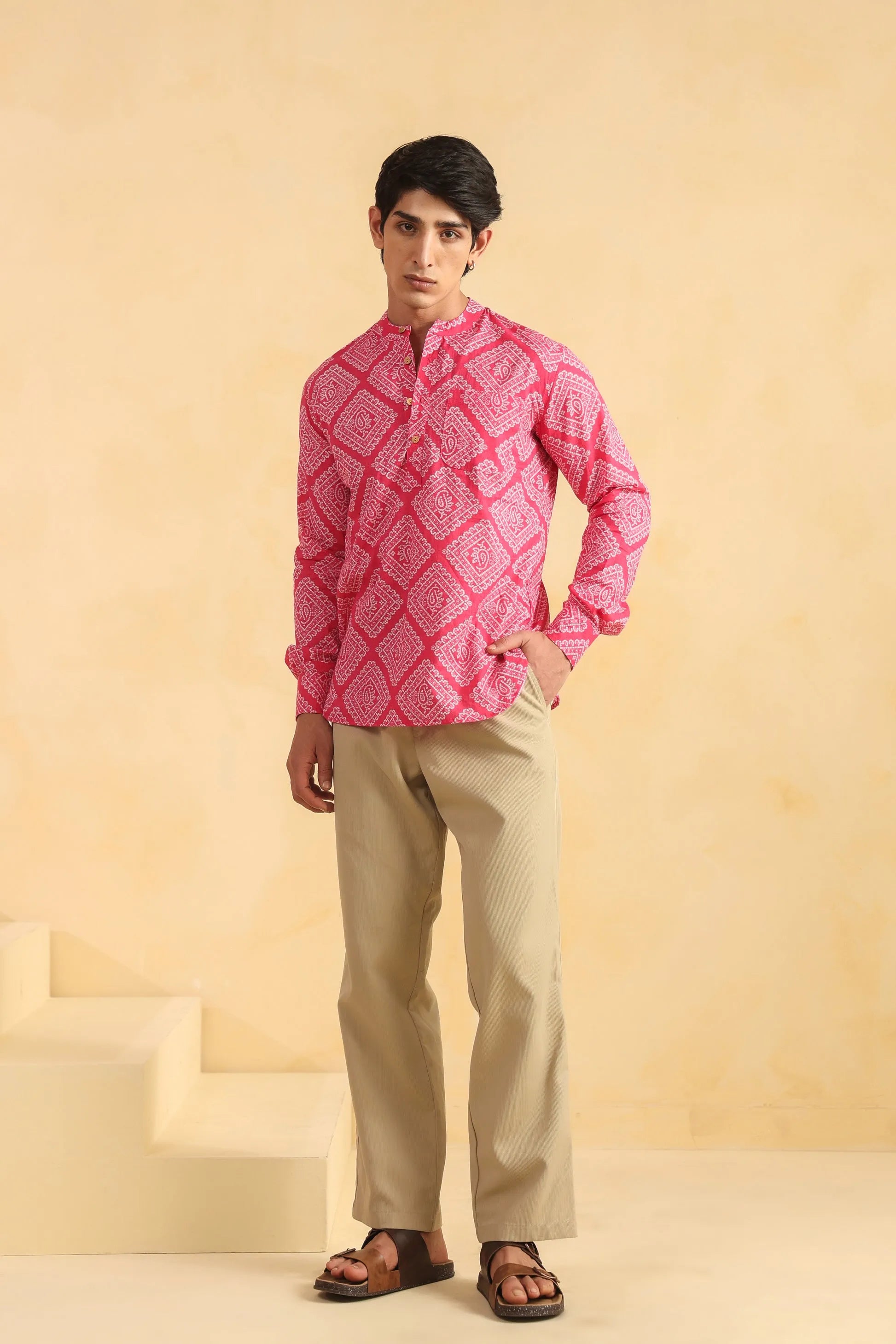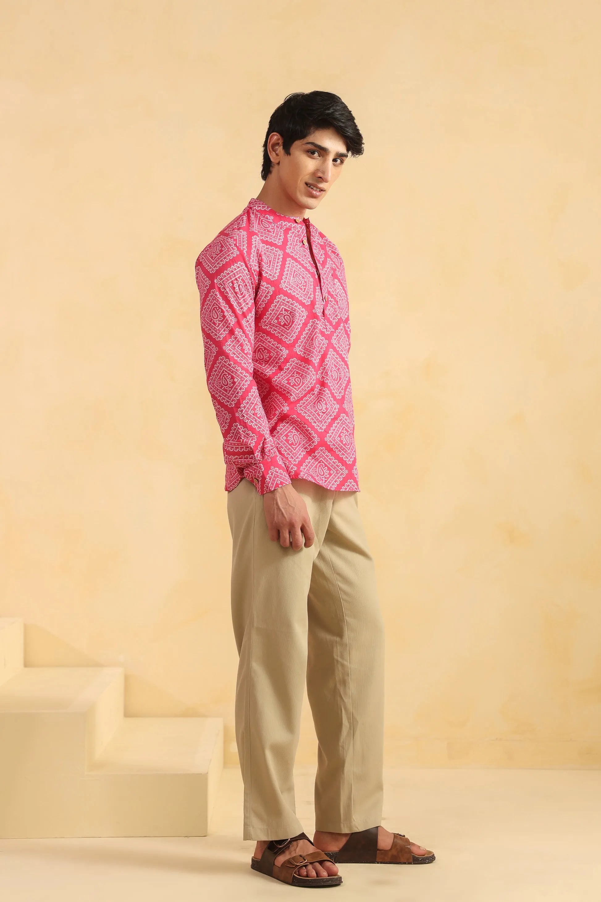 The Pink Bandhani Printed Cotton Short Kurta brings a refreshing blend of traditional charm and modern flair. Featuring a lively pink base adorned with classic white Bandhani-inspired motifs, this kurta radiates festive energy and cultural richness. The intricate print pattern adds visual depth, making it a standout piece for both daytime celebrations and casual gatherings.